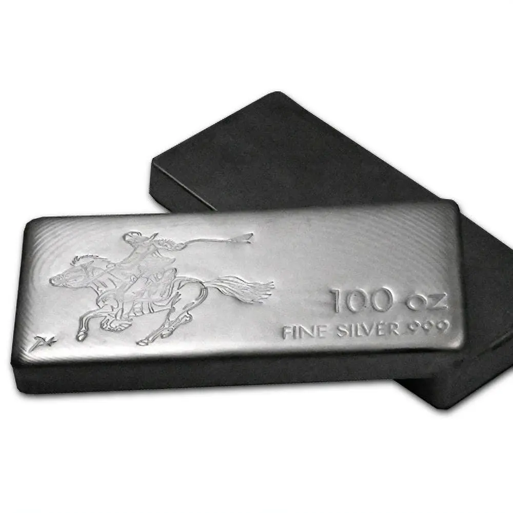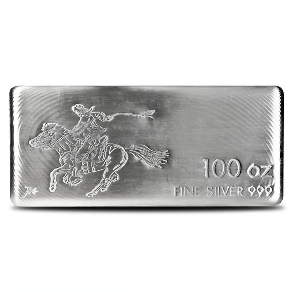 Available to you inside of individual boxes or Master Boxes of 5 bars! One of the largest cast silver bar weights! Pony Express-inspired design! Contains 100 Troy oz of .999 pure silver. Obverse features a rider of the Pony Express moving at a sprint. Reverse field is blank. Cast bullion bar production represents one of the oldest forms of bullion smelting and refining. While modern minted ingots are produced using computer-controlled presses, stampers, and laser engravers, cast bullion bar production is far simpler. In fact, the simpler approach to cast bar production explains the lower premium associated with most bars on a price-per-ounce basis.