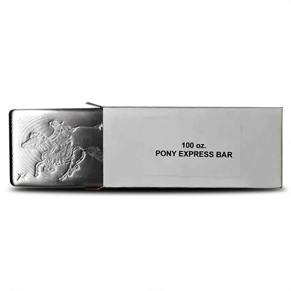 All of these 100 oz Silvertowne Pony Silver Bars are brand-new from SilverTowne. This all-new design features a rider from the Pony Express zipping across the surface of the bar. A beautiful cast silver piece, each one is packaged for shipping inside of an individual box with an identifying label. Master Boxes are available for multiples of 5 bars.
